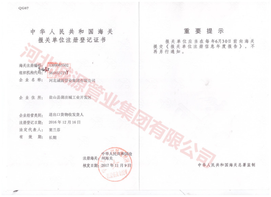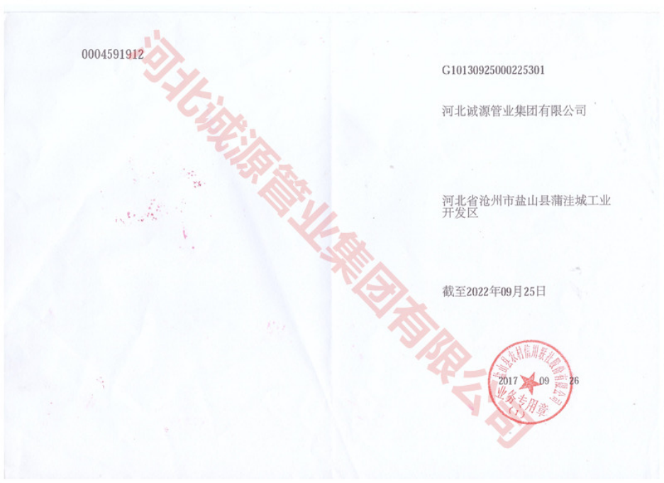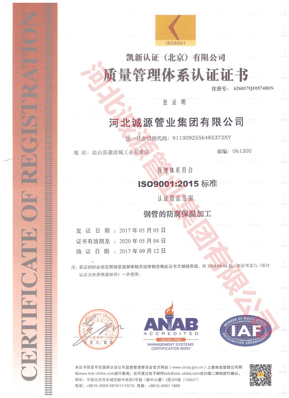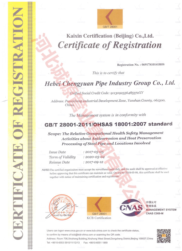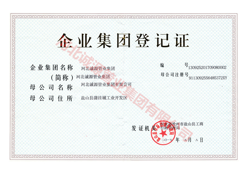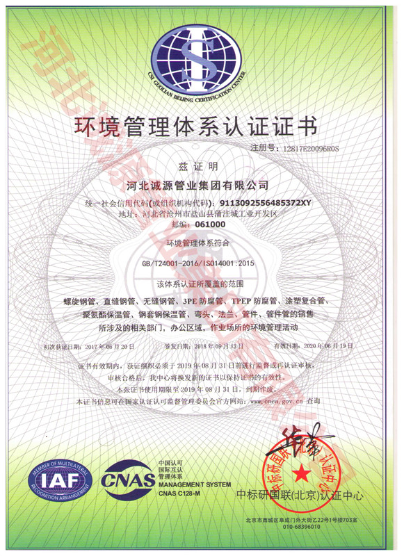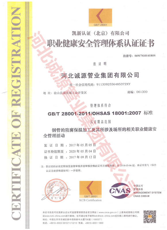 | 职业健康 管理体系认证证书 | 授予:河北诚源管业集团有限公司 | 荣誉证书 |